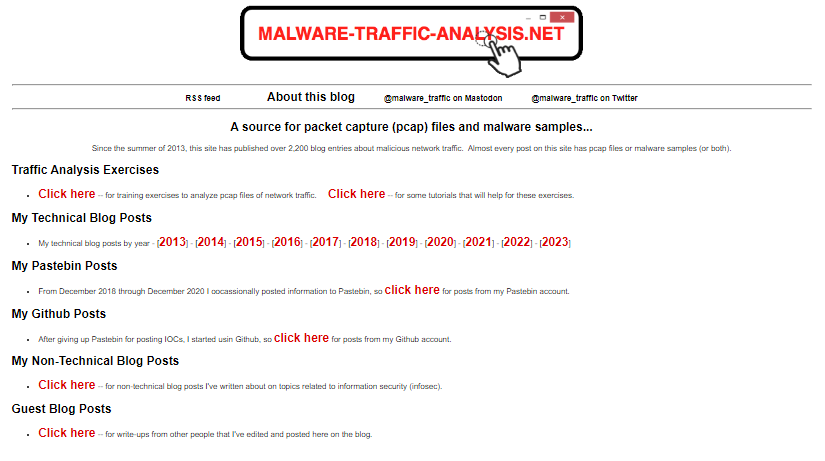The site also contains a number of traffic analysis exercises, including technical blog posts outlining techniques being used by threat actors.